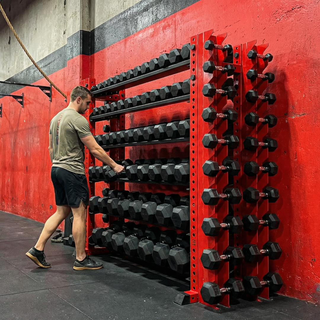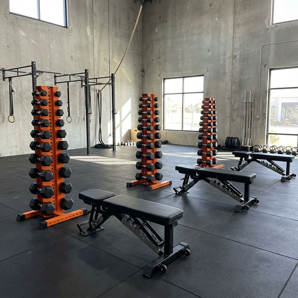 - Keep plates, dumbbells, and kettlebells easily accessible