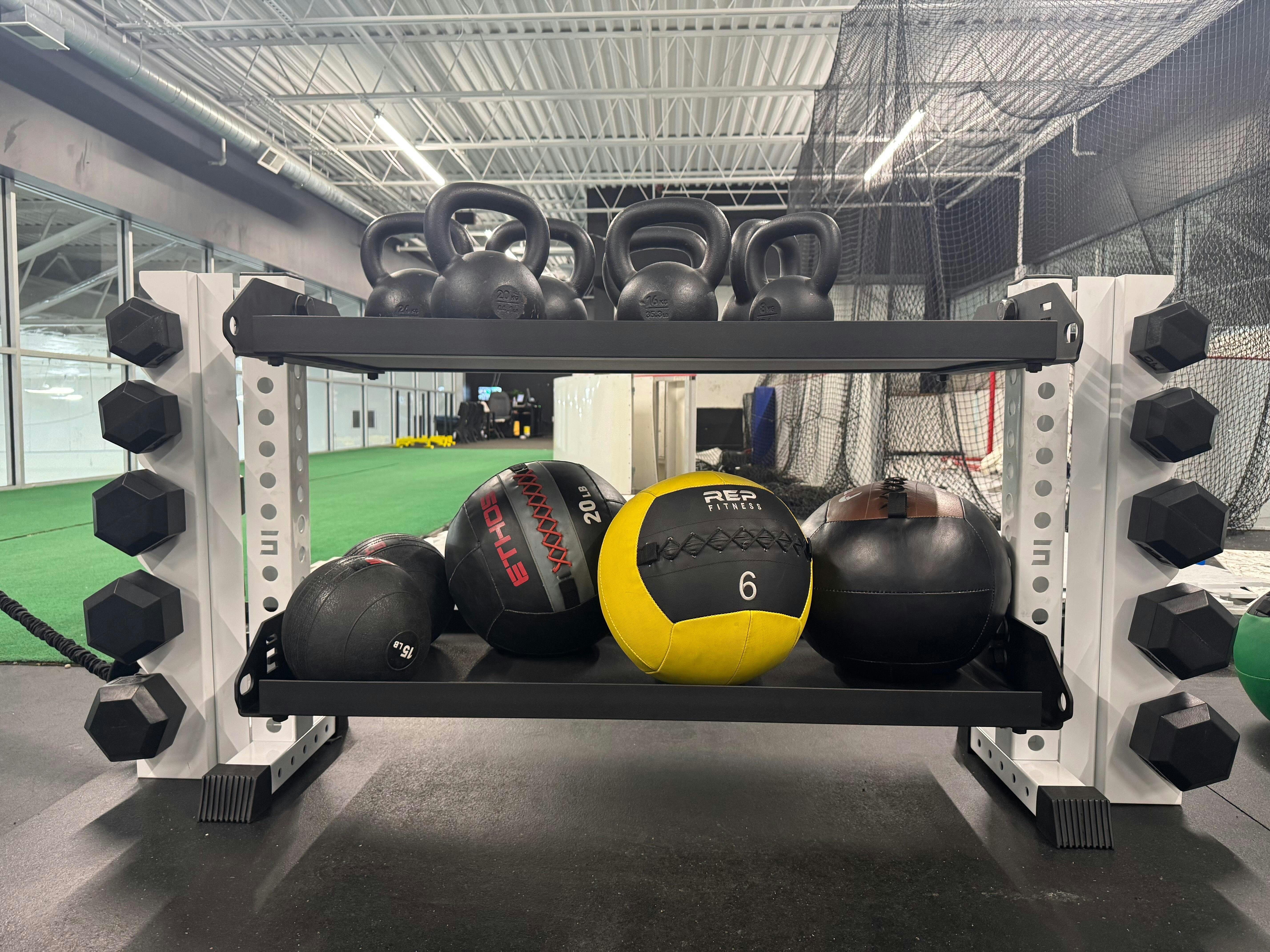A: Our Flat Panel add on is the best option for storing kettlebells, medicine balls, and other accessories!