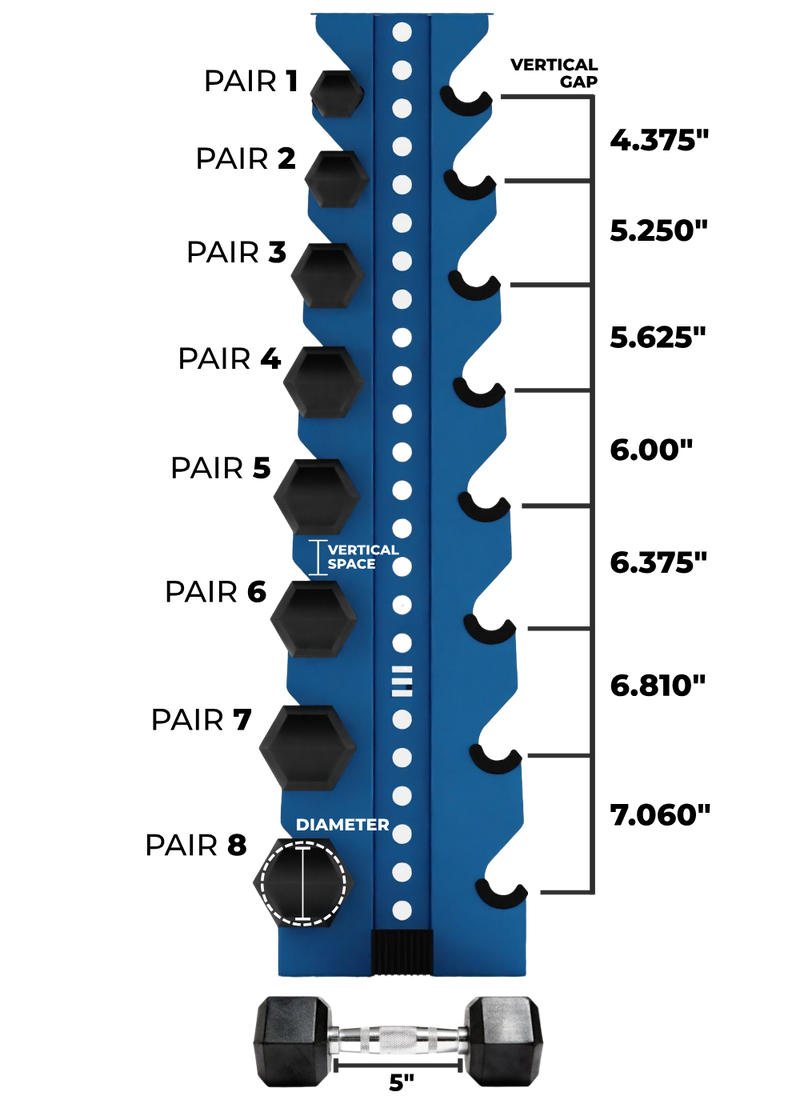 Our Alpha rack holds 8 pairs of dumbbells and was designed to store a set of 5-40 lb. However, if you have 10-45, it will fit. Given the spacing at the bottom tiers, you could fit up to 50 lb. Anything outside of this, we recommend you check out our Fitting Guide to ensure your dumbbells fit!