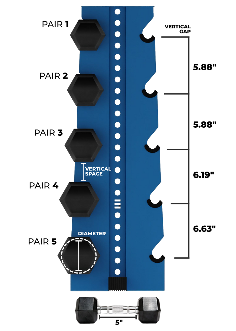 Our Alpha Elite rack holds 5 pairs of dumbbells and was designed to store your heavy sets and your dumbbells with bigger heads. Check out our Fitting Guide to ensure your dumbbells fit!