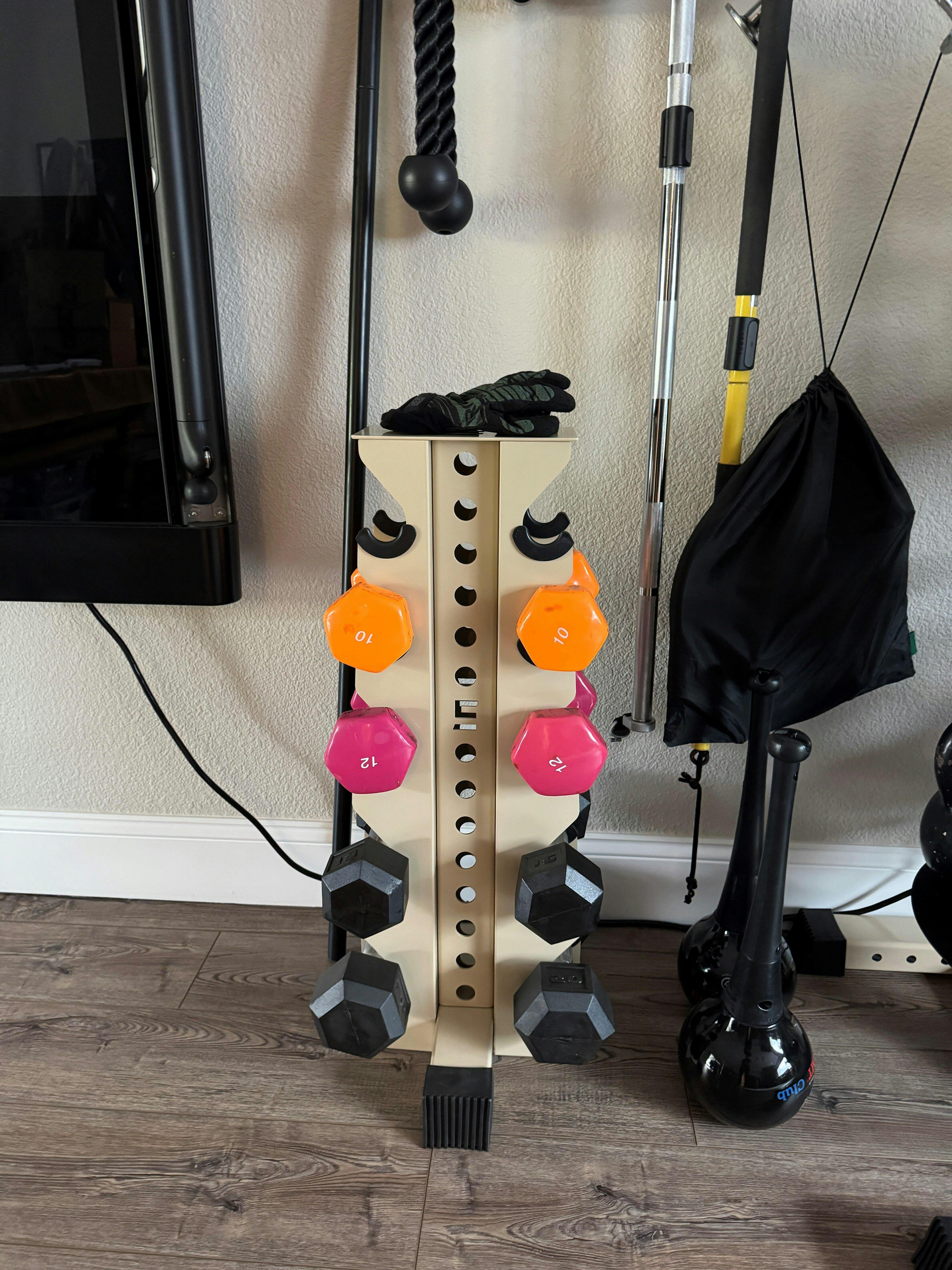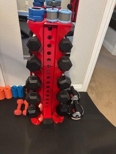 (Your dumbbell’s handle must be at least 5" long to sit properly on the rack.)