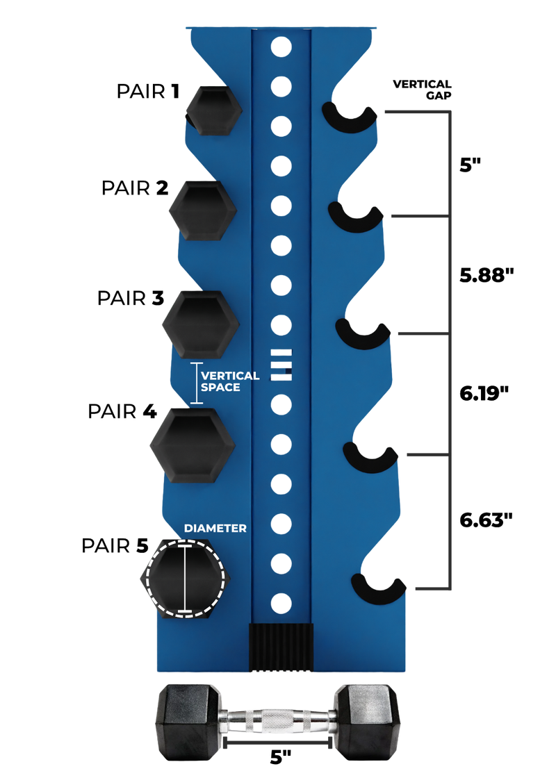 Our Bravo dumbbell rack is purpose-built to accommodate 5 pairs of hex dumbbells from 5–25 lb while maximizing your floor space through its vertical design. While the rack can accommodate heavier pairs, it is precision-optimized for the 5–25 lb range to ensure a seamless "clink-free" racking experience with maximum spacing between every tier.